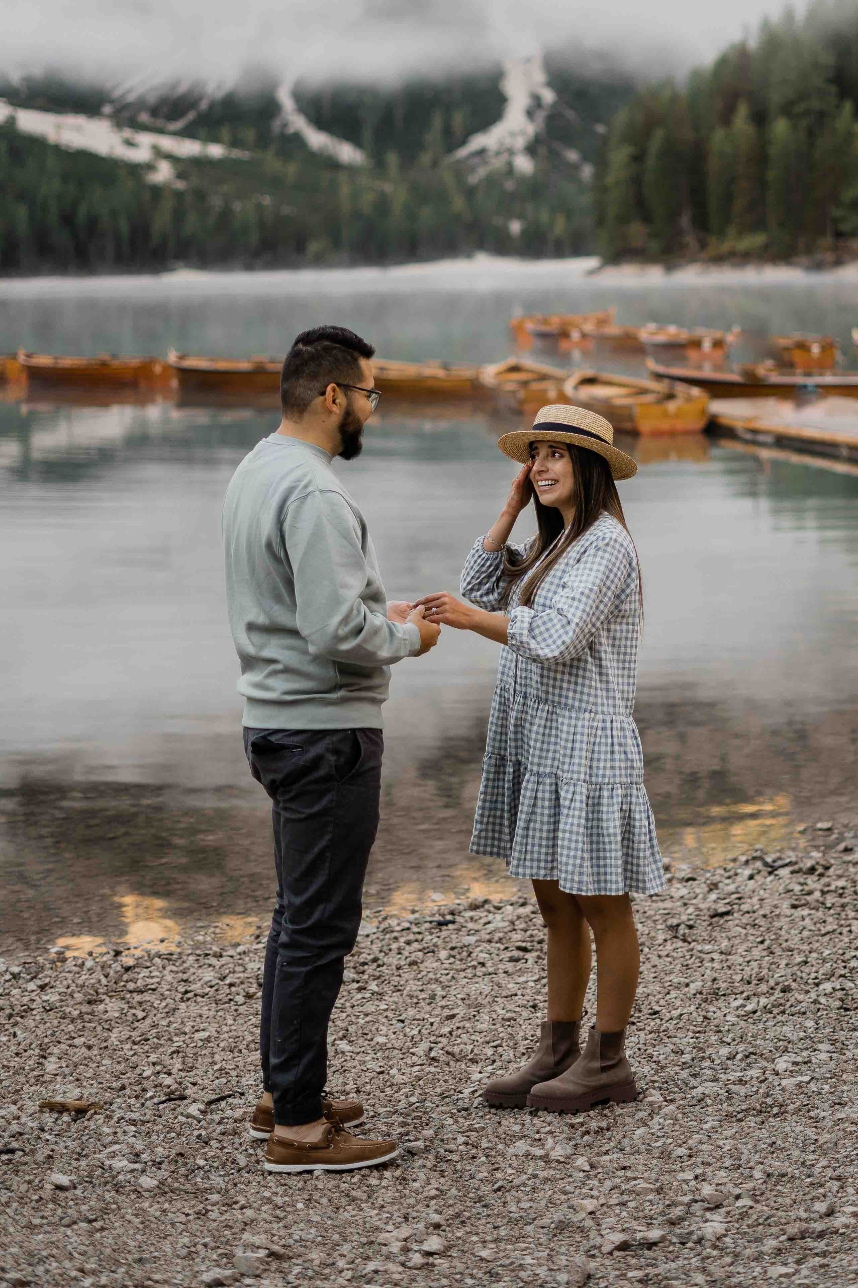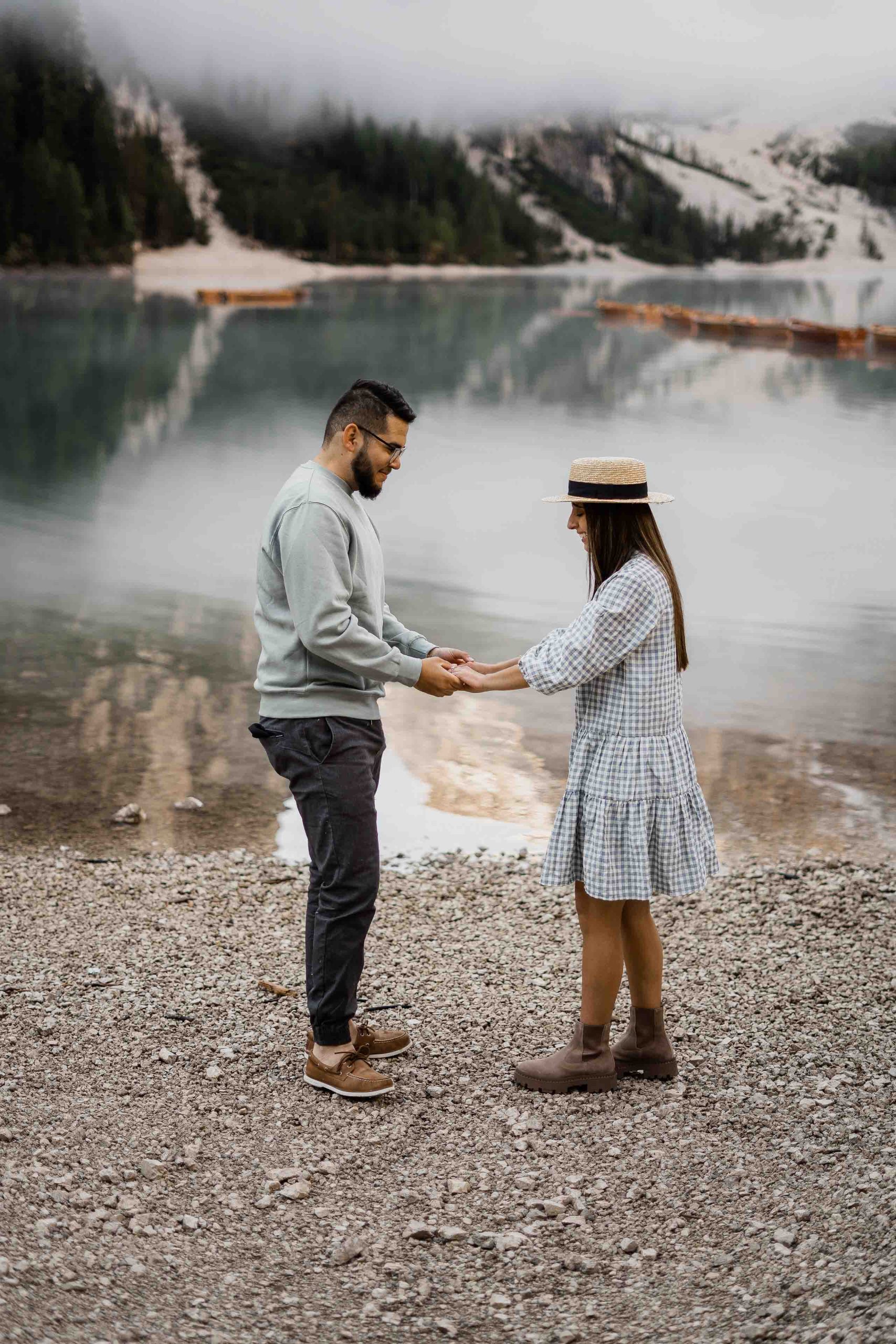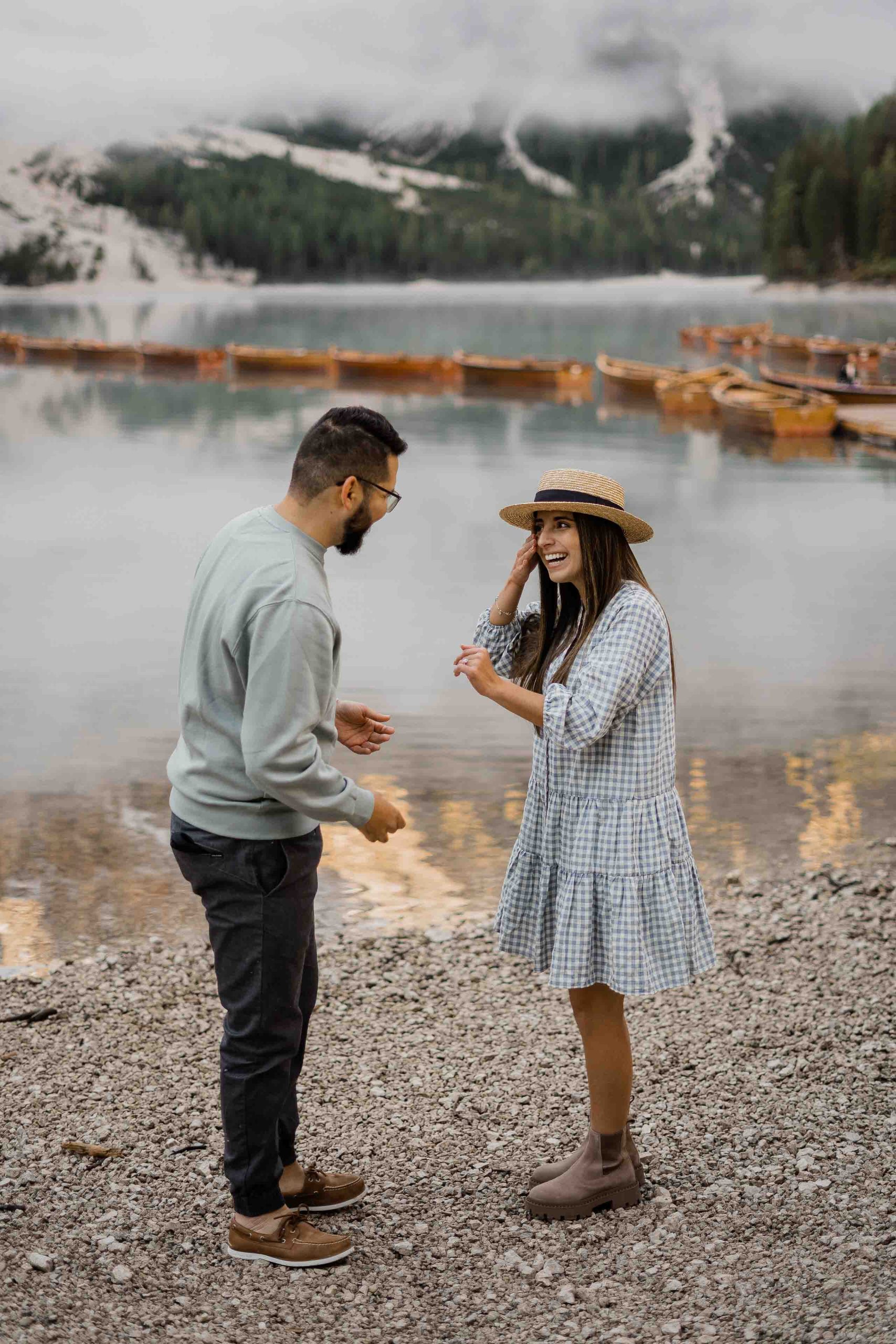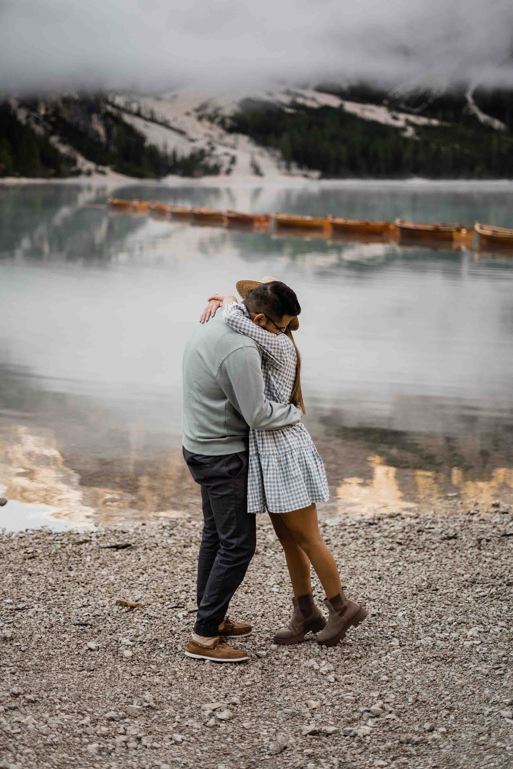 Lake Braies, with its tranquil turquoise waters embraced by towering mountains, becomes the chosen backdrop for this magical moment. The serenity and natural beauty of this alpine jewel set the stage for an enchanting proposal that will forever remain etched in their memories. The girlfriend, oblivious to her boyfriend’s plans, finds herself captivated by the ethereal charm of the surroundings, unaware of the surprise that awaits her.